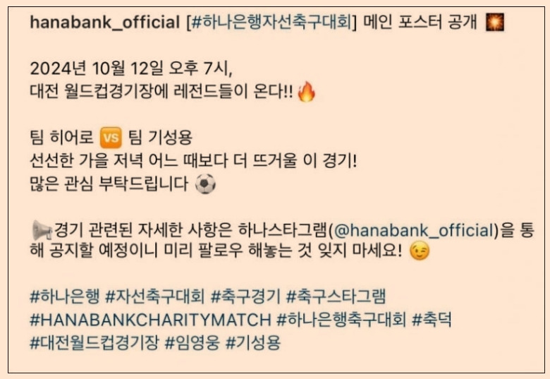 의미와 임영웅의 역할 하나은행 자선축구대회는 단순한 축구 경기가 아니라, 사회적 책임을 다하는 행사로 자리매김하고 있습니다. 이번 대회는 2024년 10월 12일 대전 월드컵경기장에서 열리며, 수익금 전액이 사회 취약계층 지원에 쓰일 예정입니다. 임영웅은 이 대회에서 팀 히어로의 주장으로 출전, 가수로서의 무대뿐만 아니라 운동장에서의 열정까지 보여주며 다방면에서 활동하는 모습으로 주목받고 있습니다. 뿐만 아니라, 대한민국 레전드 팀 주장으로 기성용 출전이 확정되면서 많은 기대를 받고 있습니다.